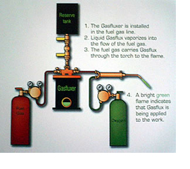 The other is GASFLUX equipment, capable of turning the liquid flux into gas, installed on the gas line and comes out with the flame, placing it directly on the welding point.